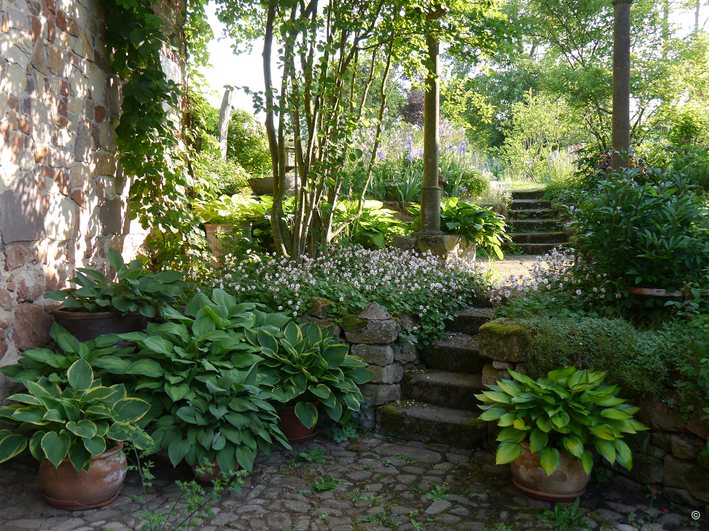 Der Hosta-Topfgarten und Aufgang zum Großen Garten
