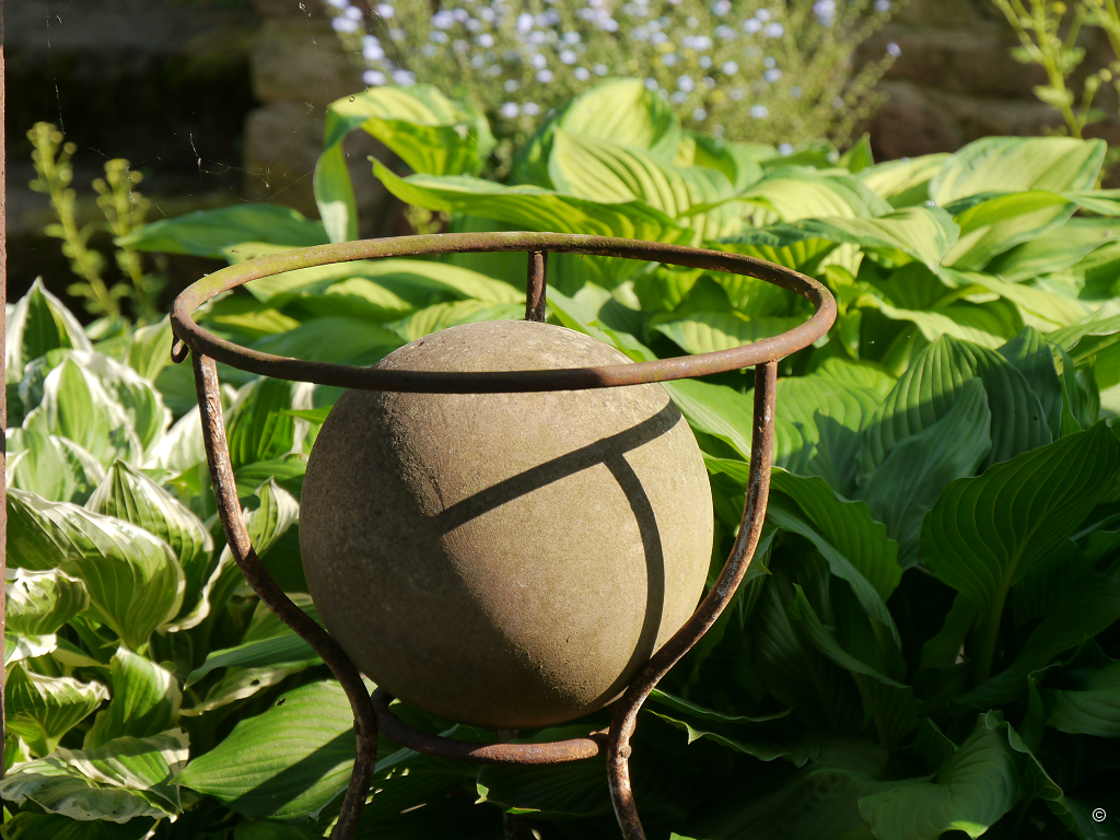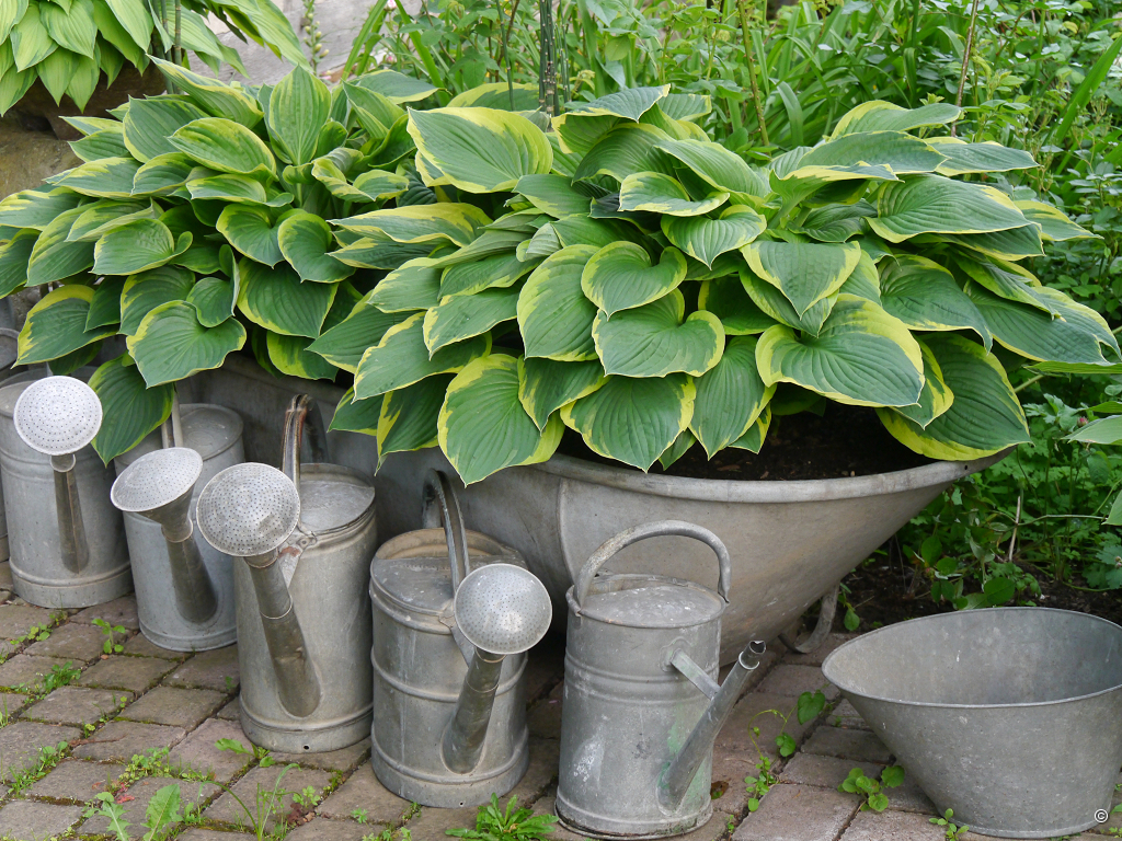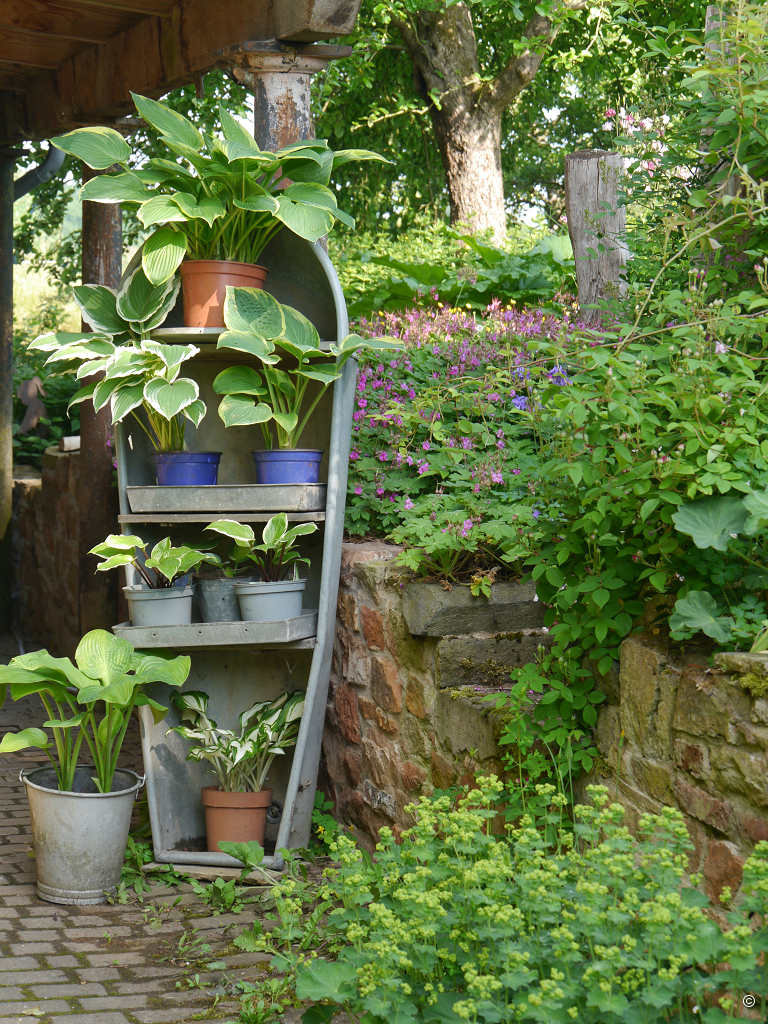 An der Hausecke des Querbaus befindet sich der Durchgang in den weitläufigen Großen Garten. Seitdem das Grundstück von Jörg terrassiert wurde, gelangt man über zwei Steintreppen zum hinteren Gartenteil. Der Zugang zur ersten Stufe ist von einer Hostatopfsammlung flankiert, die am Ende der Treppe in einem Gang, der die Hausseite nach links entlanggeht, weiterführt. Teilweise stehen die Hostas in Zinkwannen, mit dekorativen Gießkannen davor. Typisch Jörg wurde eine lange, schmale Wanne senkrecht aufgestellt, mit Fächern versehen und ebenfalls mit Hostatöpfen wie ein Regal bestückt.