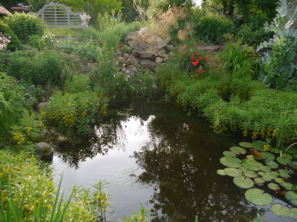Als ich die zweite Treppe nach oben gehe, öffnet sich die Kulisse zu einem vielgestaltigen naturnahen Garten, der sich ohne eigentlichen Plan, gut proportioniert, ganz selbstverständlich in die unterschiedlichsten Habitate gliedert. Es ist nichts mehr davon zu spüren, dass auf diesem 3000 qm Areal vor einem Vierteljahrhundert nichts außer Wiese, ein paar Bäumen und die Reste eines Gemüsegartens vorhanden waren.