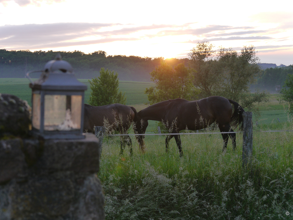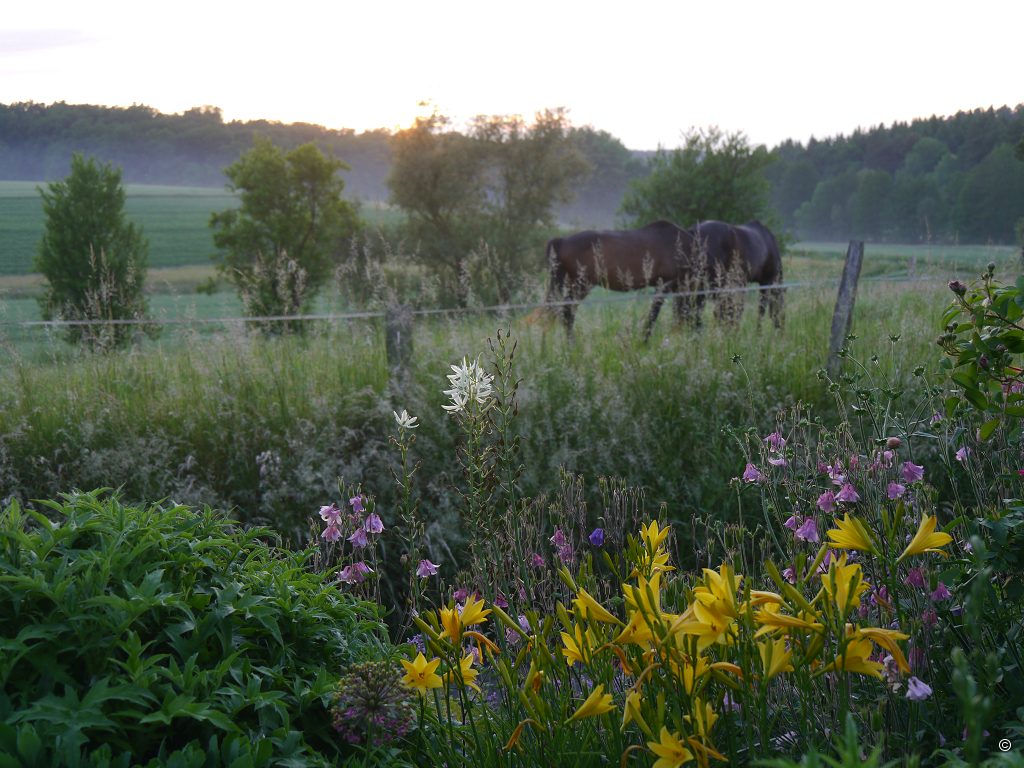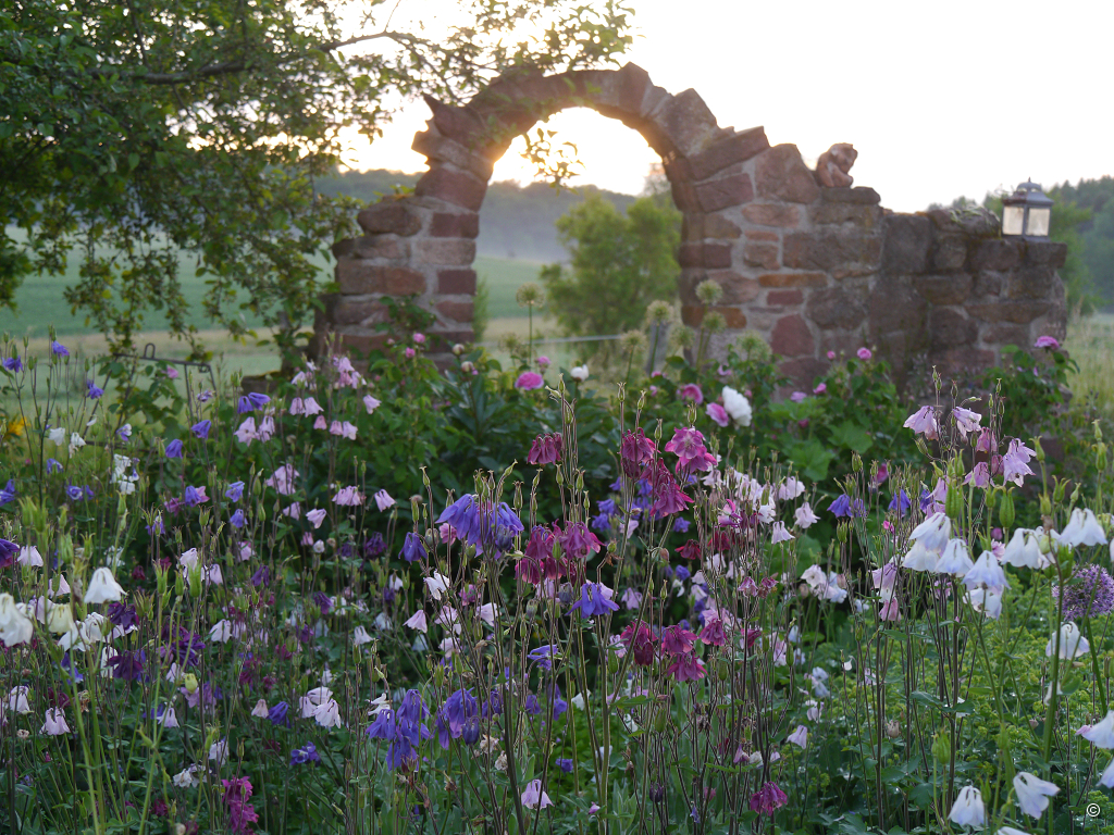 Die blaue Stunde schreitet voran. Es ist still geworden am Tisch. Bei mir klackt ab und an die Kamera, die sich wie von selbst auf den herrlichen Akeleiengarten richtet. Durch die kleine, seitlich gelegene Ruine hindurch sehe ich erste Nebelschwaden aufziehen. Es ist bereits 20.30 Uhr. Die Konturen werden immer weicher, die Akeleienblüten tanzen einen letzten Reigen in der blauen Stunde, die sich dem Ende zuneigt. Ich werde zu einem Teil des Akeleiengartens und empfinde ein großes Glücksgefühl. Was für ein Privileg, die letzten Sonnenstrahlen beobachten zu können und dazu den traumhaften Blick über das Tal hinweg bis zum Wald hin zu haben. Als die Sonne fast vom Waldsaum verschluckt ist, kommt Bewegung in die Pferde des Nachbarn und sie trotten langsam an mir vorbei in Richtung Stall.