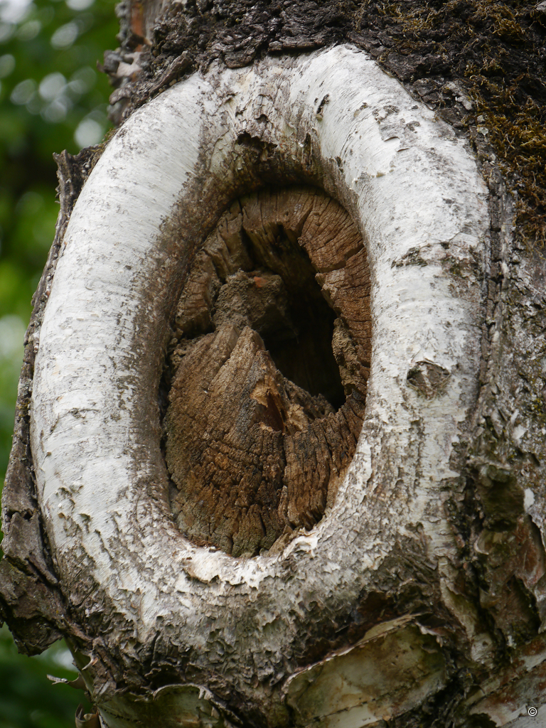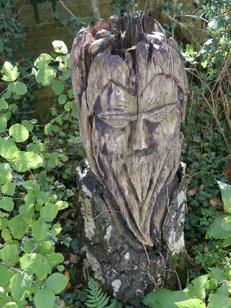 Plötzlich schiebt sich eine Wolke vor die Sonne und aus ihr regnet es genau in Wilmas Garten. Darum gehen die Beiden unter das Dach des Eingangs. Dort begegnet Wurzerl den ersten Birkenmenschen. “Aber, die sehen ja ganz anders aus als mein Birkenmann”, staunt Wurzerl. Wilma lächelt und lässt sich das Aussehen des Birkenmannes genau beschreiben. “Oh, wie schön” stellt sie fest, “dann ist er ein Leben lang geliebt worden und hat sich dabei so sehr um die Gartentiere gekümmert, dass er nun bei Dir noch lange weiterleben darf.” Auf den fragenden Blick von Wurzerl fährt sie fort: “Die Birkenmenschen, die bei mir leben, haben nicht so ein Glück gehabt, wie Dein Birkenmann. Sie waren den Menschen lästig und sind viel zu früh gefällt worden.” “Aber warum denn bloß?” Wurzerl ist fassungslos, sie kann sich gar nicht vorstellen, dass man Birken nicht lieben kann. “Tja, diese Birke, mit dem Gesicht der jungen Frau, die sie nicht mochte, ist gefällt worden, weil es der Dame zu viel Arbeit war, im Herbst das goldene Laub einzusammeln und damit gleich ihre Pflanzen zu düngen. Sie kauft lieber Kunstdünger und ließ die Birke fällen. Nun ist sie schon lange bei mir. Hast Du vorne in der alten Laterne den Frauenkopf gesehen? Bald wird einer meiner Raben fortfliegen und ein neues Herzstück eines Birkenstammes in meinen Garten geleiten. Die Frau in der Laterne lässt ihre Birke fällen, nur weil sie ihr lästig geworden ist. Darum habe ich in Kürze einen weiteren Birkenmenschen bei mir.” Das muss Wurzerl erst einmal verarbeiten. Mit einem großen Mitgefühl für Wilmas Birkenmenschen und viel Sympathie für Wilma, verabschiedet sie sich und fährt grübelnd nach Hause.