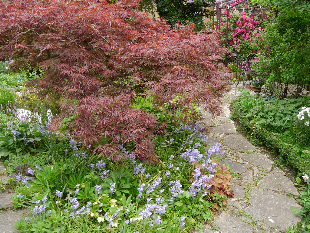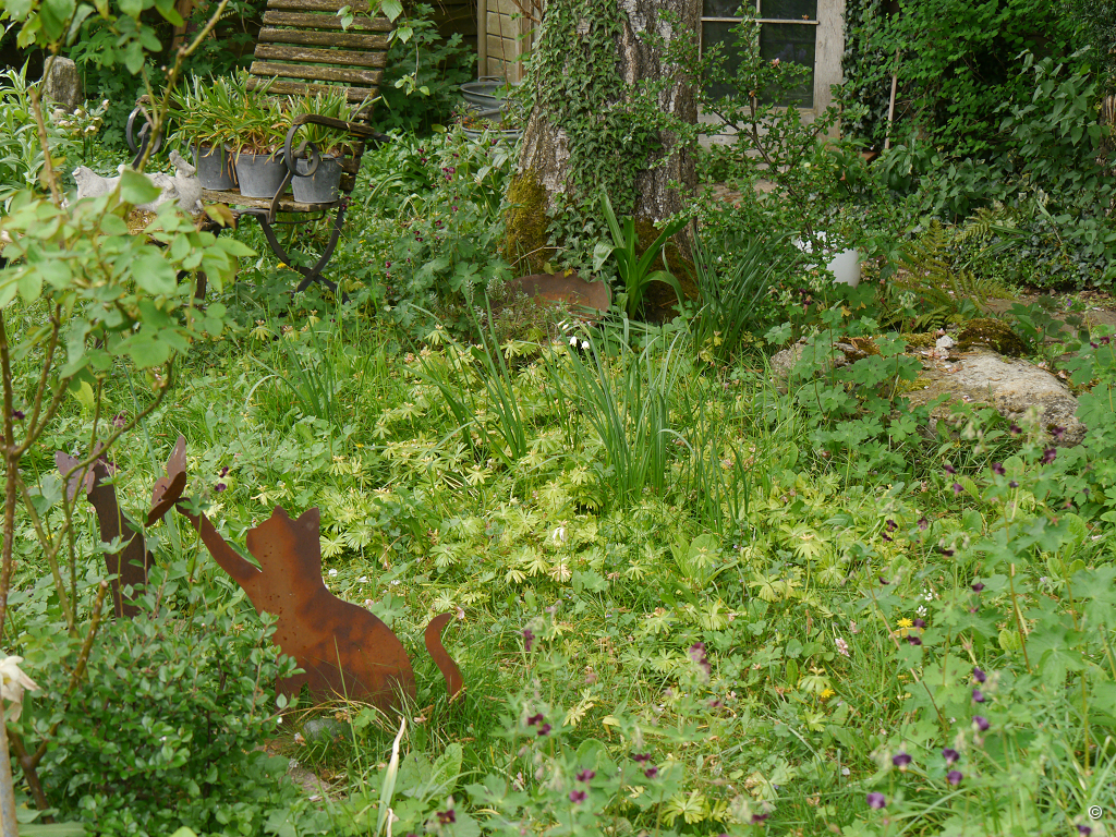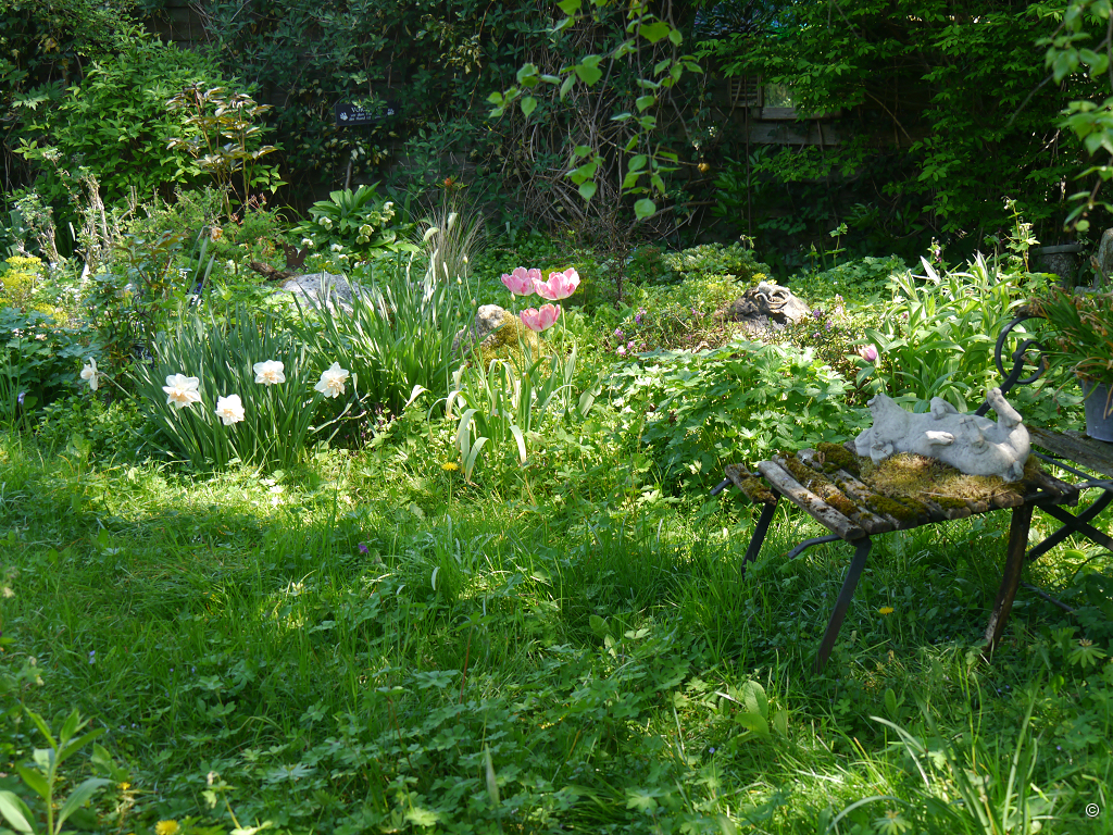 Elf Tage Garten ohne mich. Es ist wie in einer Lausbubenklasse, wenn der Lehrer fehlt. Alles blüht, alles wächst, die klaren Konturen des Gartens sind von einem auf den anderen Tag verschwunden. Die Fotos zeigen überdeutlich, dass meine “Blumen-Klasse” den Bogen weit überspannt hat. Aber, liebes Tagebuch, ich will nicht motzen, Hauptsache, es ist alles da! Gut, das Frühlingsbeet ist etwas derangiert, weil die Hasenglöckchen gerade erst gemerkt haben, dass Ostern längst vorbei ist. Den Steingarten kann ich gar nicht mehr erkennen, wenn ich über die Wiese schaue, denn da darf wegen der blatteinziehenden Geophyten noch nicht gemäht werden und das Gras ist während meiner Abwesenheit rasant gewachsen. Im Rondell legen sich die Rosentriebe um die Stangen, als wäre es das gewohnte Alte und daneben der Bachhügel ist konturlos zugewachsen, so dass nicht mal mehr die großen Steine zu erkennen sind.