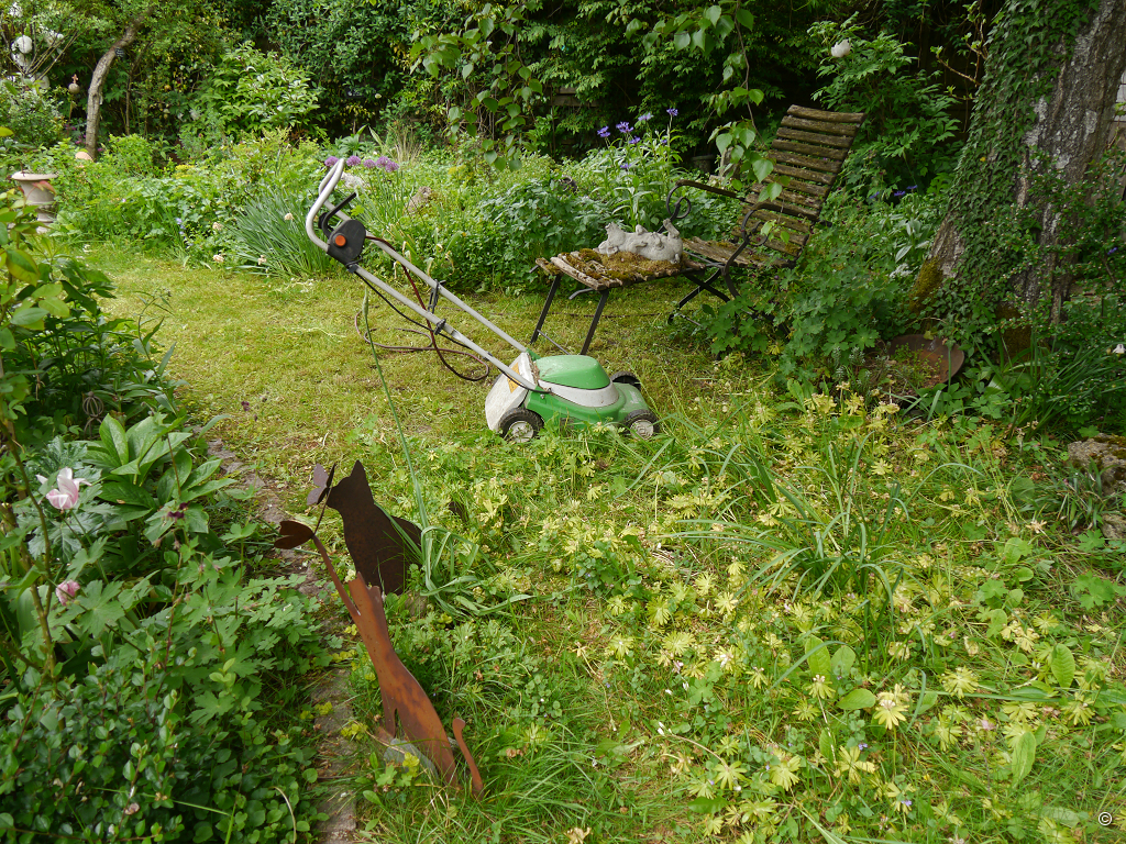 Darum hat mein abstraktes Denk(un)vermögen heute mal wieder voll zugeschlagen. Also – wir sind doch mit allem 14 Tage früher dran? Meine Wiese sieht so aus, wie sie normalerweise in 14 Tagen ausgesehen hätte. Darum ist es doch logisch, dass ich 14 Tage früher das Chaos Wiese beseitige, damit ich wieder etwas Struktur in das kleine Areal bekomme.