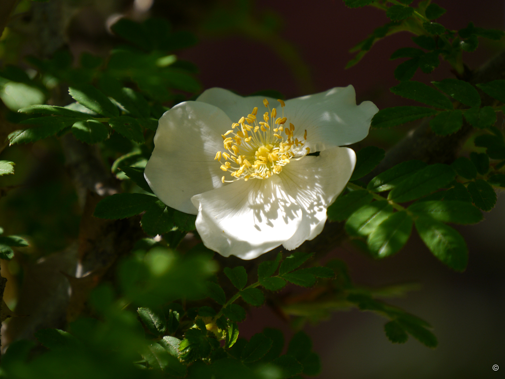 Die drei Blühsieger haben gemeinsam, dass ich sie im Wintergartenbeet stehen habe. Dadurch haben sie ein begünstigtes Kleinklima. Die weiße Stacheldrahtrose blüht seit Anbeginn als Erste, sie ist eine einmalblühende Rose aus China. Die als Nummer zwei aufgeblühte kirschrote Bibernellrose ‘Single Cherry’ ist ebenfalls eine einmalblühende Rosensorte. Einmalblühende Rosen sind generell früher dran als ihre remontierenden Gefährtinnen, da sie ihre Blütenknospen bereits im Vorjahr am alten Holz bilden. Darum schneide ich sie auch nicht wie die restlichen 25 remontierenden Rosen im Frühjahr zurück, sondern nach der Blüte im Sommer. Die remontierenden Rosen versuche ich immer schnell nach der Blüte zurückzuschneiden, damit die Nachblüte reichlich ausfällt. Das ist bei meiner Siegerin auf Platz Drei nicht ganz so einfach, Rosa ‘Ghislaine de Féligonde’ hat schlicht vergessen, dass sie eine Strauchrose ist und erobert gerade die Holzbalken unter der Terrassenüberdachung.