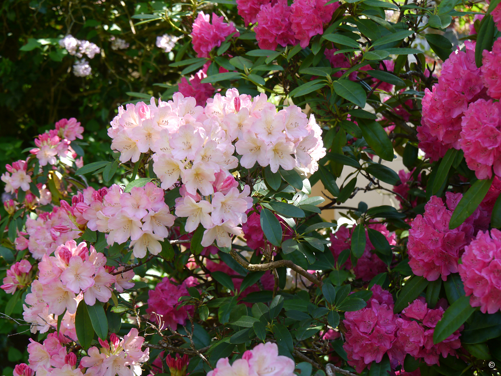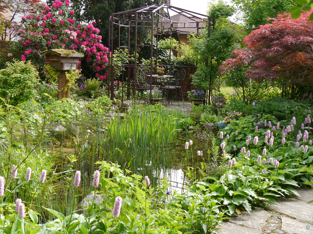 Eigentlich wollte ich nur mein Rosenrondell in vollen Zügen genießen, denn im Hintergrund stehen die Rhododendren in voller Blüte. Das ist schon eine perfekte farbliche Einstimmung auf die in einem Monat zu erwartende Rosenblüte. Über den Teich hinweg ist der Blick perfekt. Aber dann gehe ich auf die linke Seite, um über den Steingarten und die Wiese hinweg, einen anderen Blickwinkel zu genießen. Nur, da gibt es nichts zum Genießen, die Wiese ist beim Wachsen im Chaos versunken und die Konturen und Strukturen des Gartens sind total verschwommen. Es muss etwas geschehen!