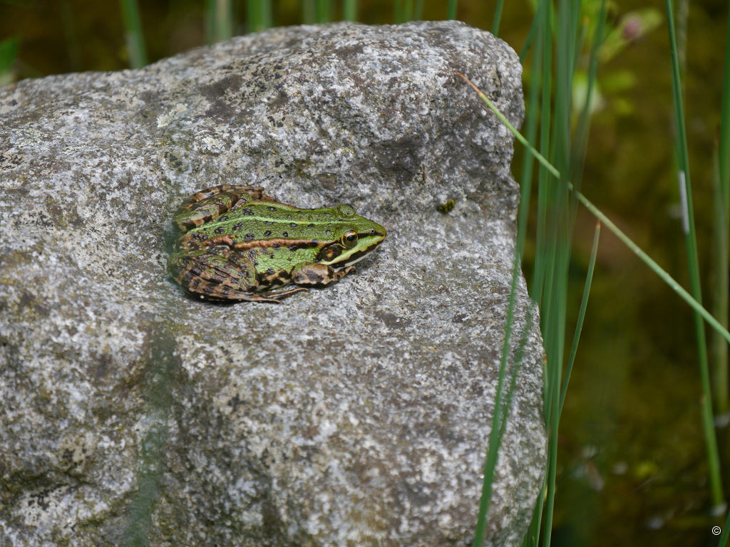 Tatsächlich habe ich nach froschlosen Jahren endlich wieder einen kleinen Prinzen im Gartenteich. Tagelang hörte ich nur ein kurzes Aufklatschen im Wasser, sobald ich in Teichnähe kam. Dann entdeckte ich zu meinem Entzücken ein kleines Fröschlein, so groß wie mein Daumennagel. Wie kam er zu mir? Als ich nach der Garten-Reise wiederkam, blieb das Platschen aus. Meine Besuchskatzen, schoss es mir durch den Kopf, oder vielleicht die Krähen? Nein, er ist noch da, vor ein paar Tagen hopste er wieder vor meinen Augen ins Wasser, er hatte das Doppelte zugelegt und war nun schon ein größerer Prinz. Gestern war er dann schon so relaxt, dass er vor dem Foto-Shooting nicht ausgebüxt ist. Also unter das Jugendschutzgesetz würde er inzwischen nicht mehr fallen, wenn ich ihn küsse. Ok, ok, mache ich nicht, ist nicht mehr mein Thema.