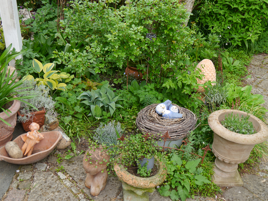 Vor dem Pflanzen musste alles an Ort und Stelle, zu viel gleich wieder entfernt und Gestaltungsfehler schnell bereinigt werden. Angefangen habe ich mit dem Moonlight, Holzkranz darauf und weißblaue Keramiktauben rein, schon hat man nichts mehr von dem verhinderten weißen Fußball gesehen. Sahen süß aus die Nestturtler, passten aber leider in der Farbe gar nicht zur Toskana-Keramik. Also alles zurück, neuer Kranz, kleiner Kranz innen dazu, etwas Moos und ein Keramikherz, nicht aus der Toskana, aber in ähnlicher Ton-Farbe, voilà, endlich zufrieden. Das Kissen hatte schnell einen Platz gefunden zwischen blauen Agapanthen in Töpfen und der hellrosa Rose ‘The Fairy’. Dann räumte ich alles weg, was zu viel war. Übrig waren nur die zwei mit Lavendel gefüllten Amphoren! Die wurden allerdings zur größten Herausforderung.