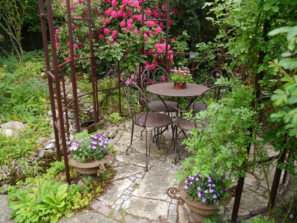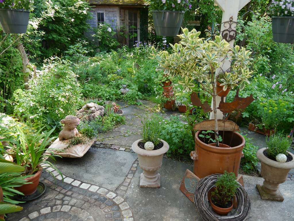 Sie waren nicht parallel zu stellen, als Wegweiser zum Toskana-Eck, wie gedacht, sie waren zu wuchtig! Aber, wo ein Wille ist, ist auch ein Weg. Ich habe mir einfach den Mittelpfeiler der Terrasse geliehen, um das Thema ein wenig auszuweiten und einen besseren Übergang zum Mixed-Border rechts am Teich zu bekommen. Das Sauerkraut-Fass ist auch an den Mittelpfeiler gewandert, italienisch? Ach was, die Toscani essen sicher auch einmal im Jahr Weißkraut. Opas Stühle stehen jetzt an der Tür zur Bibliothek, da sehe ich sie auch und hier sind sie perfekt vor Regen geschützt.