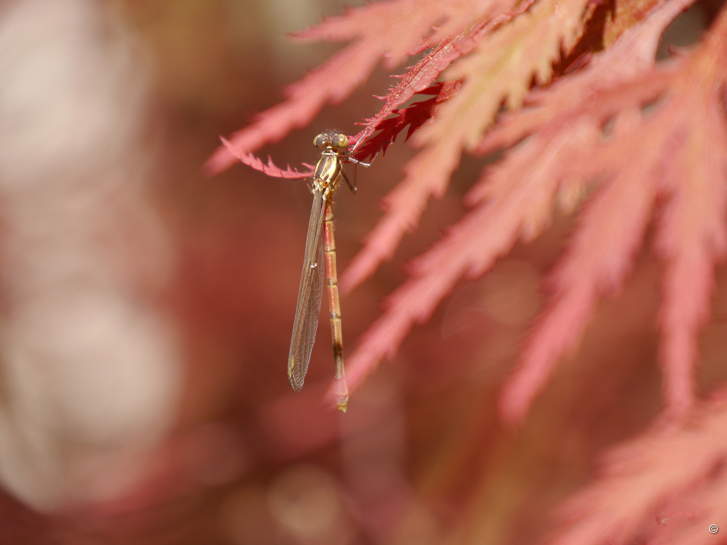 Die Libellenlarven haben angefangen sich in wunderschöne Flugobjekte zu verwandeln. Die ersten sind bei mir normalerweise immer die blauen Schlanklibellen. Dieses Jahr habe ich noch keine entdeckt. Dafür fliegt eine rote Libelle vor meiner Nase auf die Ahornblätter in Wassernähe. Ich kenne mich nicht besonders aus, wünsche mir aber, es wäre die Frühe Adonislibelle, einfach weil ich den Namen so schön finde. Momentan gehört der Teich diesen zarten Geschöpfen, damit sie in Ruhe für Nachwuchs sorgen können. Sobald das erledigt ist, beginnt das Schauspiel der großen Mosaikjungfern, die im Sommer das Gebiet des Uferbereichs für sich allein beanspruchen. Anfangs hatte ich auch Plattbauch- und Vierflecklibellen, aber das sind eher Pioniere, denen mein Teich inzwischen zu sehr zugewachsen ist.
