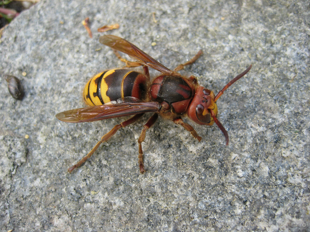 Gerade kommt mein Kamikaze-Flieger um die Ecke. Die Hornisse wohnt in der Hecke auf der anderen Straßenseite und hat ihr Stammlokal an meinem Teichrand. Plötzlich fällt mir ein Artikel ein, den ich gestern in einer Gartenzeitschrift entdeckt habe. Die invasive Asiatische Hornisse ist bei uns auf dem Vormarsch! Sie ist hinterhältig, denn sie siedelt sich in der Nähe von Bienenstöcken an, um dort die Honigbienen abzufangen. Offenbar hat sie keine natürlichen Feinde, darum hilft nur, ihr Nest in den Bäumen im Sommer rechtzeitig zu entdecken und dieses von einem Fachmann (wie gendert man das denn, ist eine Fachfrau nicht auch ein Fachmann?) entfernen zu lassen. Die Asiatische Hornisse ist ein wenig kleiner als unsere Heimische und dunkler gezeichnet als diese. Vorsichtshalber mache ich ein Foto und bin beim Vergleich am Monitor beruhigt, es ist meine alte Kamikaze-Freundin, die da um die Ecke kam. Irgendwie schon lustig, dass die italienische, zweirädrige Stilikone ebenfalls Vespa genannt wurde.