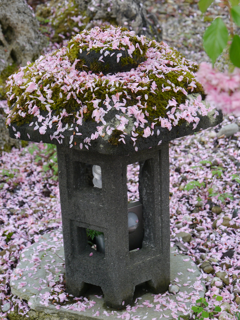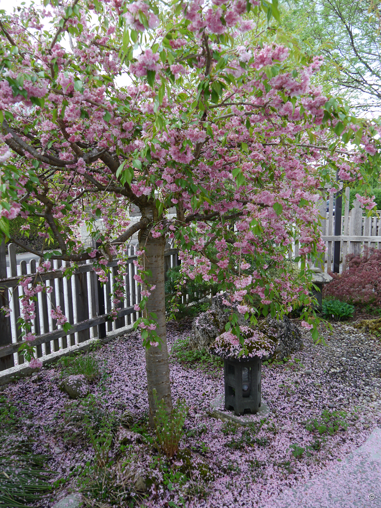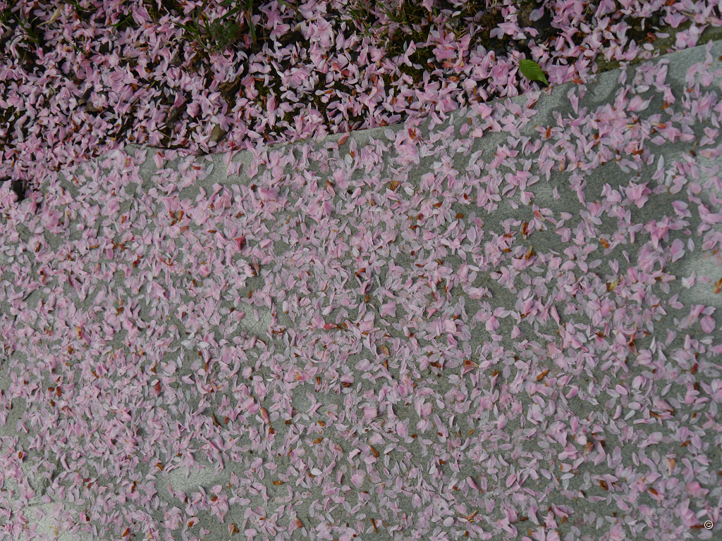 Und dann ist da noch dieser Fronleichnamsteppich mit rosa Blüten! Die Zierkirschen! Es gibt in unserer Straße zwei riesige adulte Exemplare auf der gegenüberliegenden Straßenseite. Solidarisch steht ein kleineres Hänge-Zierkirschen-Exemplar in meinem Vorgarten. Es ist ein kurzes Vergnügen, wenn die zwei riesigen “Rosa Elefanten” auf meinen kleinen “Rosa Wattebausch” herunterspucken. Wenn der April seine stürmische Laune zeigt, ist der Spaß in einer Woche vorbei. Das heißt, nicht ganz vorbei. Nun sind mein Gehweg und mein Vorgarten bonbonrosa überschneit. Mein eigenes Kirschbäumchen weicht höflich aus und ergießt sich auf meinen Weg vom Gartentor zum Haus. Damit haben sie schon mal dauerhaft (an der Schuhsohle) einen Fuß drin in der Haustür.